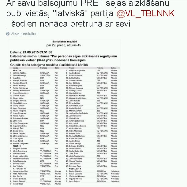 Arī A. Kaimiņa kungs dalījies ar šo sarakstu un apskatot to atklājas, ka neviens no Nacionālās apvienības VL-TB/LNNK deputātiem nav balsojis "par" parandžu nēsāšanas aizliegumu publiskās vietās, turklāt pieci no NA deputātiem balsojuši "pret". Jānorāda, ka visi septiņi klātesošie LRA deputāti, ieskaitot pašu Kaimiņa kungu, nobalsojuši "par" parandžu aizliegumu.
