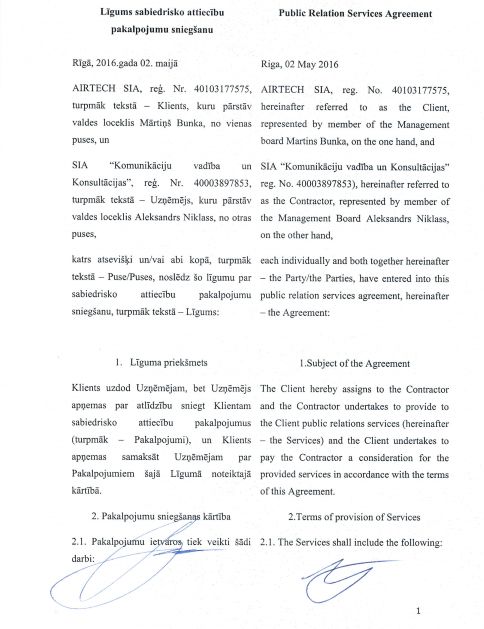 Pirmais dokuments liecina, ka ar Šveices pilsoni un lielas Latvijas valsts mantas pārvaldītāju Rudolfu Meroni saistītā firma AIRTECH jau kopš pērnā gada maija algo sabiedrisko attiecību kompāniju SIA Komunikāciju vadība un konsultācijas. Kā uzzināms publiski pieejamos avotos, šī ir polittehnologa Aleksandra Niklasa kompānija. Par saņemtajiem sabiedrisko attiecību pakalpojumiem AIRTECH maksā viņam 5000 eiro mēnesī plus nodokļus. Otrs dokuments ir vēlēšanu kampaņas uzmetums, kura autors it kā ir tas pats Aleksandrs Niklass. Tā vismaz rakstīts apakšā. Te gan uzreiz jāpiebilst, ka viņš pats atzīst tikai pirmā dokumenta - līguma - autentiskumu. Savukārt otrais neesot viņa sacerēts. A. Niklass nerakstot angliski, ja raksta - tad uz veidlapas, turklāt 2016. gada jūnijā radītā sacerējuma grafiks neatbilstot notikumiem realitātē.