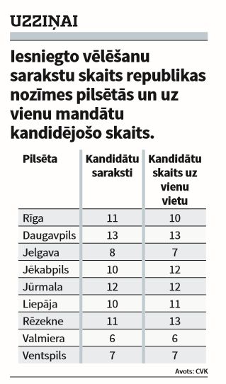 Ja vērtē pēc pieteikto sarakstu skaita, tad, šķiet, ka viens no gardākajiem kumosiņiem starp republikas nozīmes pilsētām šajās vēlēšanās ir Rēzekne. Pilsētā, kurā pagājušajās pašvaldību vēlēšanās uz vēlēšanu iecirkni neaizgāja pat 40% balsstiesīgo, šogad pieteikti 11 sarakstu jeb 13 cilvēku uz vienu vietu pilsētas domē. Arī otra iekārotākā pašvaldība atrodas Latgalē. Uz Daugavpils domes 15 mandātiem pieteikušies 11 sarakstu jeb 13 kandidātu uz vienu mandātu.