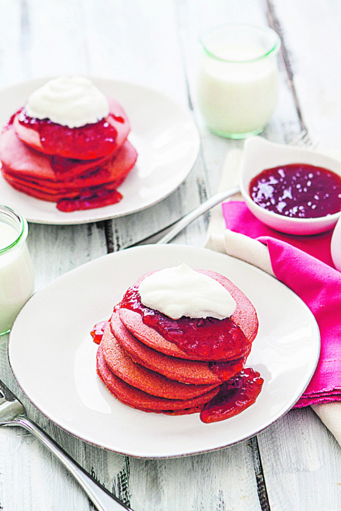 Bietes sarīvē, sablenderē un caur marli izspiež sulu. Olas sakuļ, pievieno pienu un biešu sulu, kā arī izkausētu sviestu, maisot pa daļām liek klāt miltus, līdz iegūst viendabīgu plāno pankūku mīklu. Pannu ieziež ar taukvielu, sakarsē, cep plānās pankūkas, aptuveni 2 minūtes no katras puses. Saloka četrās daļās, kārto uz šķīvja, pasniedz ar ievārījumu vai skābo krējumu.