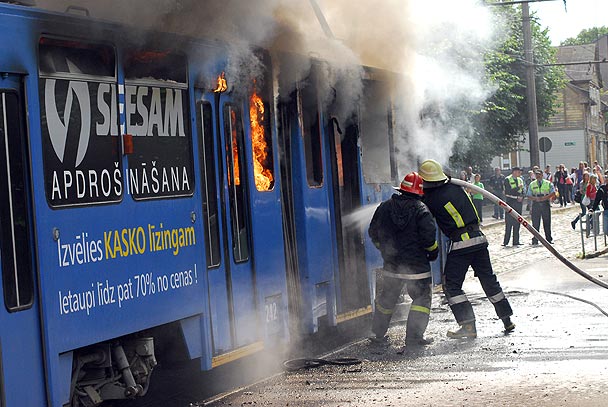 Tramvaja vadītāja strauji metusies ārā no kabīnes un rosinājusi pasažierus pēc iespējas ātrāk pamest vagonu.