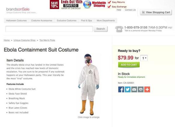 Tematiskos Ebolas vīrusa aizsargkostīmus var iegādāties internetā par nepilniem 80 dolāriem gabalā. Ārsti ir šokā par sabiedrības neiecietību un tās melno humora izjūtu, brīdī kad Ebolas vīrusa izplatība pasaulē nekontrolēti pieņemas spēkā un cilvēki infekcijas skartajos reģionos turpina mirt. "Manuprāt, man ar humora izjūtu viss ir kārtībā, tomēr, nes nesaprotu, kā šobrīd ebolas vīruss var likties uzjautrinošs un smieklīgs. Tā izplatību šobrīd vēl nav iespējams kontrolēt," savu viedokli pauž ārsta palīdze Marija Mackenna.