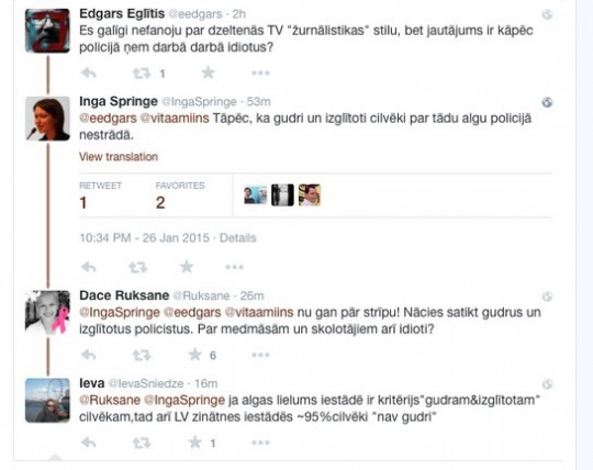 Kā jau ziņots, žurnāliste Inga Spriņģe sociālajā tīklā uz jautājumu "Es galīgi nefanoju par dzeltenās TV "žurnālistikas" stilu, bet jautājums kāpēc policijā ņem darbā idiotus?" atbildējusi: "Tāpēc, ka gudri un izglītoti cilvēki par tādu algu policijā nestrādā."