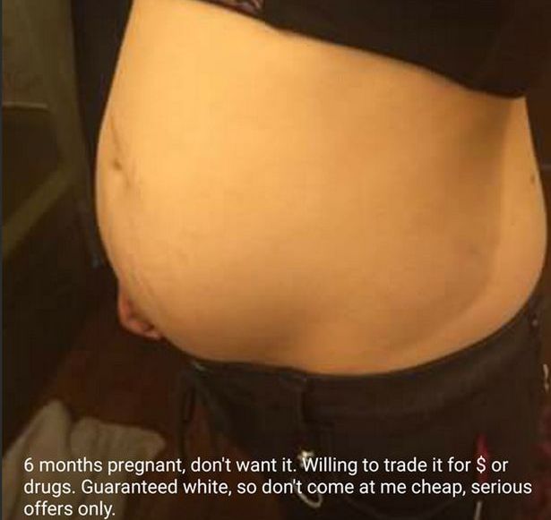 “Esmu sestajā grūtniecības mēnesī un vēlos pārdot mazuli pret naudu vai narkotikām,” raksta grūtniece, kura arī norāda, ka bērns būšot baltādains, tādēļ lēti to neatdošot.