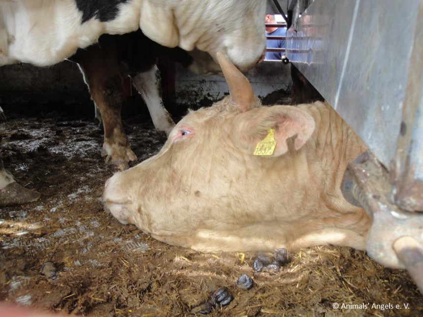 Tiek vēstīts: "Tālajos pārbraucienos dzīvniekus bieži ved slikti aprīkotās kravas piekabēs, kur dzīvnieki var gūt savainojumus. Šī buļļa galva iestrēga zem sadalošās sienas un visu garo ceļu viņš pavadīja, gulēdams mēslos un pārējo buļļu sabradāts. Lūdzu, palīdzi mums #StopTheTrucks! Paraksti petīciju http://www.stopthetrucks.eu/en/!"