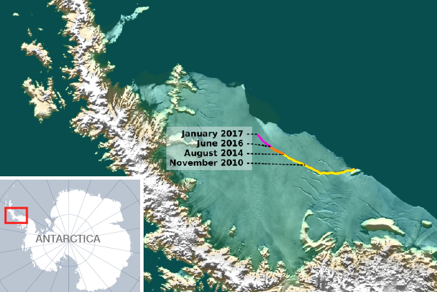 Augustā atklāts, ka plaisa sešu mēnešu laikā sasniegusi 22 kilometru garumu. Savukārt decembrī novērota strauja aisberga sairšana - plaisa bija pieaugusi vel par 18 kilometriem.