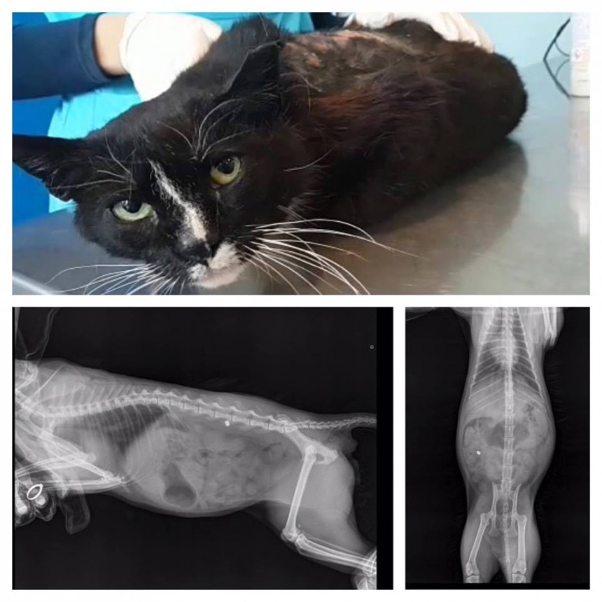 Sestdien tika saņemts Mikša rentgens - apstiprinājās ārsta aizdomas par to, ka runcis ir sists. Pakaļkāju disfunkciju izraisījuši stipri sitieni pa mugurkaulu, kā rezultātā traucēti nervu impulsi. Uz Miksi ir arī šauts - ķermenītī joprojām atrodas skrots, šobrīd ārsts lemj, vai to jāņem ārā un vai tā apgrūtina Mikša kustības. Kaķis arī ir ļaunprātīgi dedzināts, visticamāk, izmantota uguns un metāls, kā rezultātā gūtas briesmīgās muguras brūces.