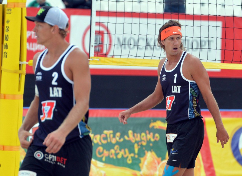 Ar piekto numuru izsētie Aleksandrs Samoilovs un Jānis Šmēdiņš Longbīčas "Grand Slam" sāka ar uzvarām pār Kanādas un Austrālijas duetiem, jau pēc divām spēlēm nodrošinot vietu izslēgšanas spēlēs. Šonakt Latvijas pāris cīnījās par pirmo vietu grupā (un iespēju atpūsties pirmajā izslēgšanas spēļu kārtā), taču nācās samierināties ar pirmo zaudējumu Longbīčā un otro vietu grupā.