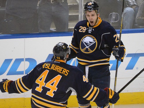 Trešdaļas izskaņā “Sabres” pārkāpa noteikumus, otro periodu iesākot skaitliskajā mazākumā. Lai gan “Predators” nespēja to realizēt, tomēr mājnieku hokejisti sāka spēlēt arvien nedisciplinētāk, pirmajās 40 minūtēs nopelnot piecus noraidījumus. Arī latviešu hokejists Zemgus Girgensons mača vidū pārkāpa noteikumus pret viesu vārtsargu, uz divām minūtēm dodoties uz noraidīto soliņa. Turpinājumā tuvu rezultāta atklāšanai bija “Predators”, norībinot Noivirta sargāto vārtu stabu, bet 14. sekundes pirms došanās pārtraukumā, negaidīti vadībā izvirzījas Bufalo “Sabres”, kurai tas bija septītais metiens pa pretinieku vārtiem. Vispirms Zemgus Girgensons labi nospēlēja ar augumu, bet pēc tam ar nūjas neērto pusi atdeva piespēli vārtu priekšā esošajam Taileram Enisam, kurš atklāja spēles rezultātu (1:0).