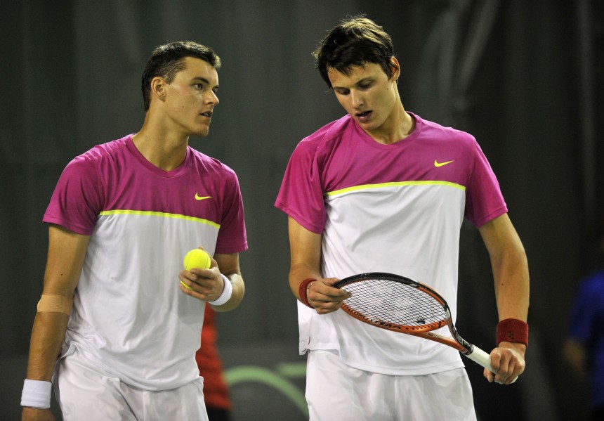 Plānoto mača gaitu Liepājā izjauca lietus, kura dēļ Latvijas un Madagaskaras tenisistu dubultspēle varēja sākties tikai trīs ar pus stundas vēlāk nekā paredzēts. Atcelta spēle gan netika, un Mārtiņš Podžus un Miķelis Lībietis to uzsāka visai pārliecinoši - pirmajā setā tika zaudēts tikai viens geims, un pretinieki no Āfrikas tā arī ne reizi netika pie breikpunkta. Sets noslēdzās nieka 22 minūtēs.