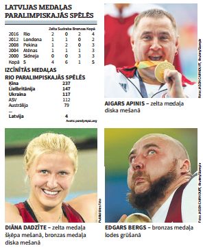 Latvijas komandas startu paralimpiskajās spēlēs Latvijas Paralimpiskās komitejas prezidente Daiga Dadzīte vērtē kā izcilu, jo kopumā izcīnītas četras medaļas, kas ir vislielākais nopelnīto medaļu skaits paralimpiskajās spēlēs Latvijai. Latvijas paralimpiskie sportisti izcīnīja divas zelta medaļas un divas bronzas medaļas. «Mūsu mērķis bija uzlabot sportistu personisko rezultātu,» saka Daiga Dadzīte, kā joku piebilstot faktu, ka personisko rekordu nav pārspējis vien vieglatlēts Aigars Apinis, kurš izcīnīja zelta medaļu diska mešanā. Neatkarīgā rakstīja, ka Aigara «kroņa sporta veids» ir lodes grūšana, taču šajā disciplīnā sportista medicīniskajai klasei sacensības Rio nenotika.