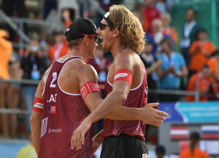 Latvijas duetam pirmais mačs jau plkst. 16.30 (Latvijas laiks), kad pretī stāsies poļi Fijaleks / Brils, bet plkst. 21.30 latvieši sacentīsies ar Brazīlijas duetu.