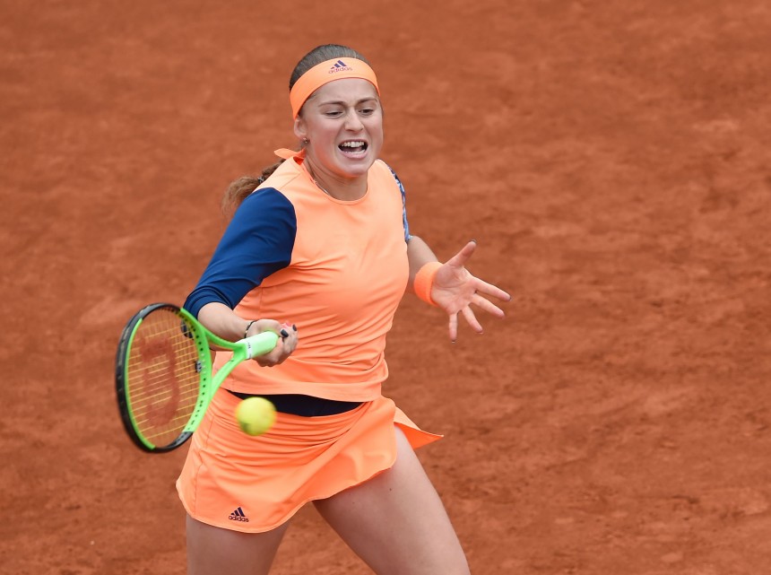 Ostapenko 1. setā ļoti iespaidīgi nospēlēja uzņemšanā, kur ar agresīvu un pārsvarā precīzu spēli pamatīgi ierobežoja Mugurusas iespējas diktēt spēli. Ostapenko regulāri pretinieci piespieda kļūdīties un dominēja spēka spēlē, Mugurusai setā ne reizi neļaujot noturēt servi. Tas nozīmēja, ka Aļona abus geimus zaudēja ar savu servi, un tas notika identiski. Gan pie 4:0, gan 5:1 Mugurusa divreiz uzbruka vājām Ostapenko otrajām servēm, bet Ostapenko breikbumbas izspēlē kļūdījās ar "forehand" uzbrukumu.