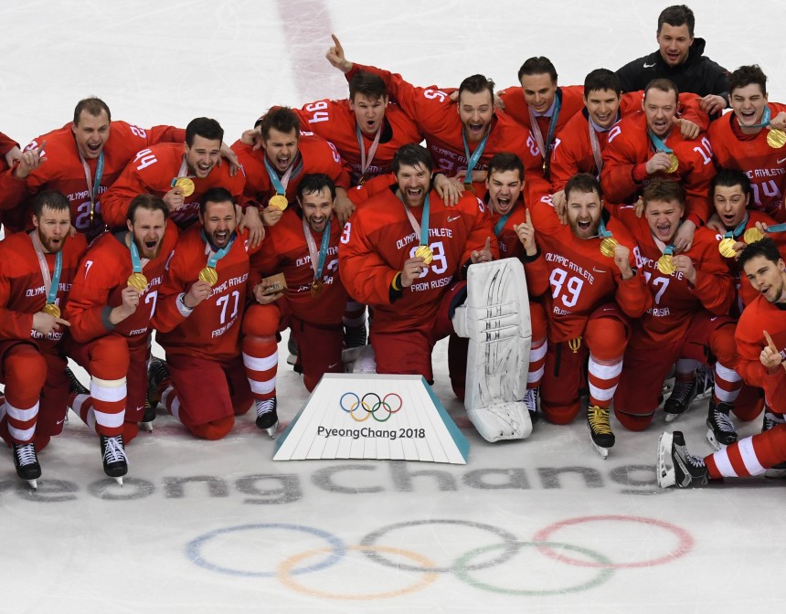 Par Phjončhanas olimpisko spēļu čempioniem hokejā kļuvuši Olimpiskie sportisti no Krievijas, kuri dramatiskā finālā ar 4:3 pagarinājumā pieveica Vācijas izlasi. Krievi izglābās pamatlaika pēdējā minūtē, turklāt tobrīd atradās mazākumā. Uzvaras vārtus vairākumā guva Kirils Kaprizovs.