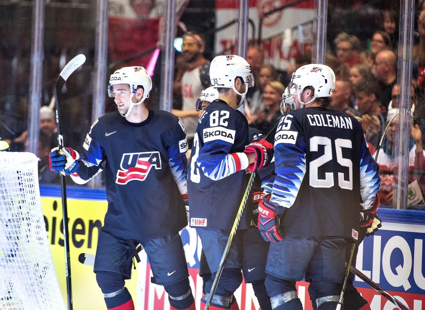 Pirmo uzvaru Dānijā notiekošajā pasaules čempionātā izcīnīja ASV izlase, kas pēcspēles metienu sērijā pārspēja Kanāda ar 5:4. Divus vārtus uzvarētāju laba guva Dilans Larkins.