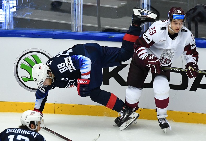 Tikai dienu pēc pievienošanās komandai un bez neviena treniņa kopā ar komandu pirmo spēli 2018. gada pasaules čempionātā aizvadīja Teodors Bļugers, un centra uzbrucēja rezultatīvā piespēle palīdzēja Latvijas izlasei atņemt vienu punktu amerikāņiem – 2:3 pagarinājumā. Pēc dueļa viņš norādīja, ka laukumā juties labi, taču ir bijis arī labāk.