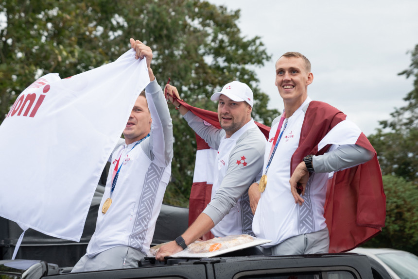 Sportisti Latvijā ielidoja ar reisu no Helsinkiem, kas nedaudz aizkavējās. Latvija sportistus sagaidīja ar lietu un stipru vēju, bet sagaidītāji - ar gavilēm.