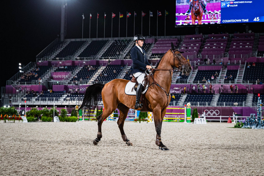 Latvijas sportists Kristaps Neretnieks trešdien Tokijas olimpiskajās spēlēs jāšanas sportā fināla sacensībās konkūrā ar zirgu "Valour" nopelnīja 13 soda punktus.