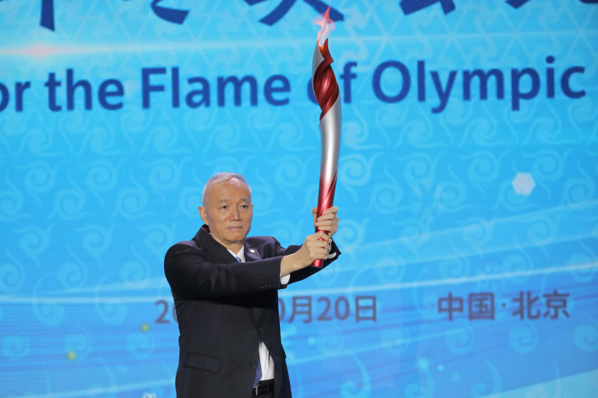 Pekinas Pašvaldības komitejas un Pekinas spēļu organizatoru komitejas vadītājs Cai Cji aizdedzināja uguni Olimpiskajā tornī.