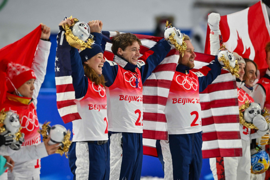 Pekinas olimpisko spēļu komandu sacensības akrobātiskajos lēcienos ceturtdien uzvarēja ASV frīstaila slēpotāju jauktā komanda.