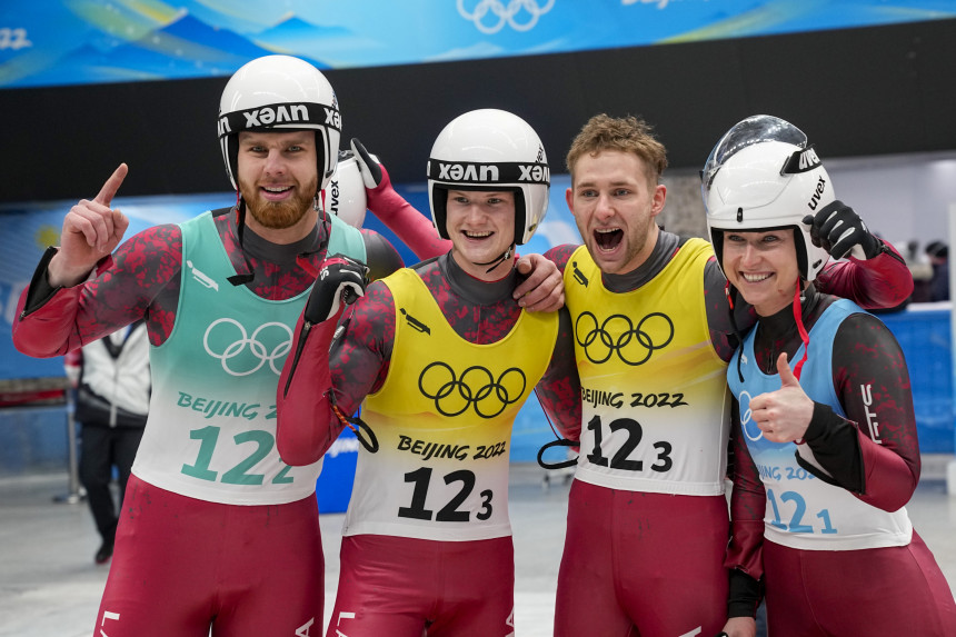 Latvijas kamaniņbraucēji Elīza Tīruma un Kristers Aparjods, kā arī divnieku ekipāža Mārtiņš Bots/Roberts Plūme Pekinas olimpisko spēļu komandu stafetē izcīnīja bronzas medaļas, bet trešo reizi pēc kārtas olimpiskā čempiona titulu ieguva Vācija.