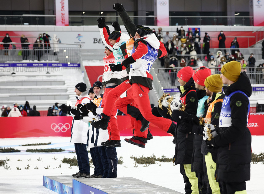 Pekinas ziemas olimpisko spēļu vīriešu komandu sacensībās tramplīnlēkšanā ar slēpēm pirmdien uzvarēja Austrijas četrinieks.