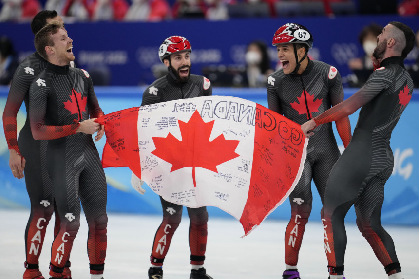 Kanādas šorttrekistu trešdien uzvarēja Pekinas olimpisko spēļu 5000 metru stafetē.