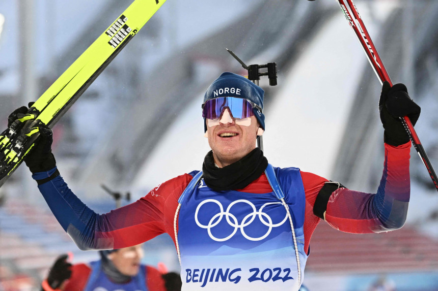 Norvēģijas biatlonists Juhanness Tīngnēss Bē piektdien Pekinas olimpiskajās spēlēs triumfēja 15 kilometru distancē ar kopēju startu un tika pie piektās godalgas šajās olimpiskajās spēlēs.