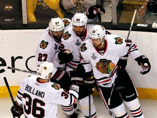 Cīņā par Stenlija kausu izlīdiznājumu panākusi Čikāgas "Blackhawks", kura ļoti rezultatīvā mačā ar 6:5 pieveica Kaspara Daugaviņa pārstāvēto Bostonas "Bruins". "Bruins" spēles gaitā četras reizes atspēlējās, taču pagarinājumā uzvaras vārtus guva "Blackhawks" aizsargs Brents Sībruks.