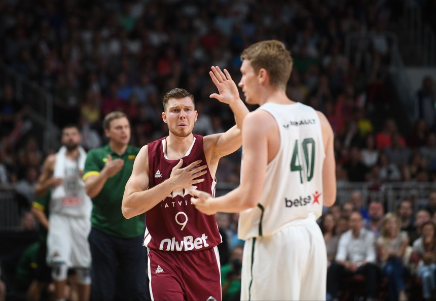 Latvijas treneri pieteica 13 spēlētājus, lietuvieši - 14. Malā palika plecu savainojušais Ojārs Siliņš un centra spēlētājs Iļja Gromovs, savukārt Mārtiņš Meiers tika pieteikts pēc slimības. Laukumā izgāja pieci vīri, kuri pērn pārstāvēja NBA klubus - Kristaps Porziņģis, Dāvis Bertāns, Jons Valančūns, Mindaugs Kuzminsks un Donāts Motejūns.