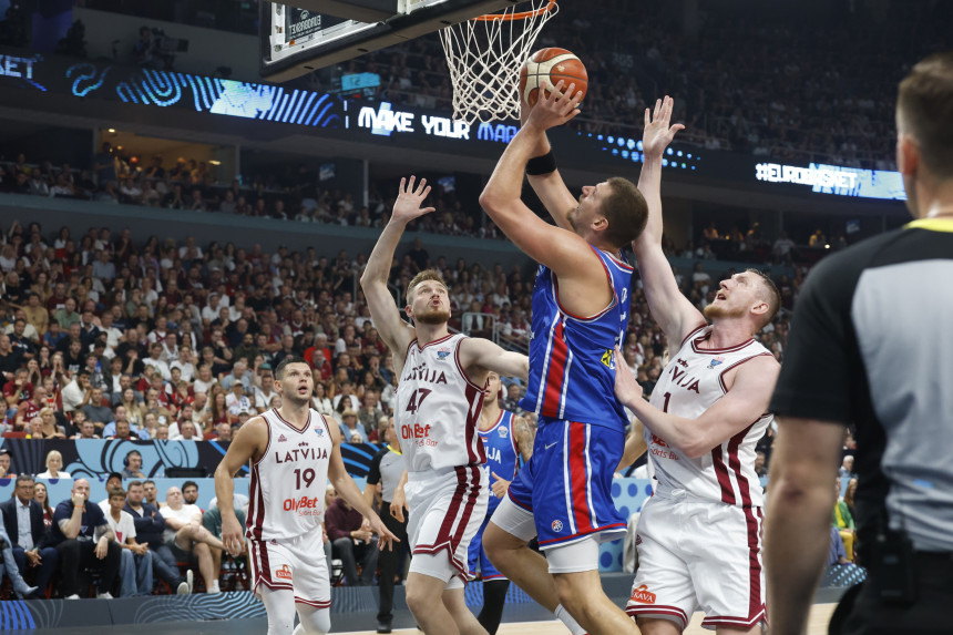 Latvijas vīriešu basketbola sestdien Rīgā Eiropas čempionāta finālturnīra trešajā mačā ar rezultātu 80:84 (18:22, 20:20, 18:25, 24:17) zaudēja meistarsacīkšu favorītei Serbijai ar Nikolu Jokiču sastāvā.