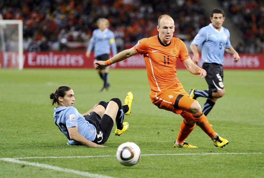 Holandieši pirmo momentu izveidoja jau 4. minūtē - Arjens Robens savā malā apspēlēja pretinieku, izdarīja centrējumu, bumba nonāca pie Dirka Kauta, kurš no labas pozīcijas sita pāri. Vēlāk cerīgu Veslija Sneijdera raidījumu nobloķēja... partneris Robins van Pērsijs. Urugvajai pretējā galā divreiz nepaveicās ar aizmugures stāvokļiem (tie bija uz robežas), bet pirmie vārti pēkšņi krita 18. minūtē. Neticams sitiens no aptuveni 30 metriem padevās Džovanni van Bronhorstam, bumbai ielidojot pašā vārtu devītniekā! Skaisti, eleganti un 1:0 Nīderlandes labā! Drīz vien moments soda laukumā bija arī Robenam, taču uzsist viņš nepaspēja. Turpinājumā notikumu nebija daudz, un uz ilgu laiku spilgtākais brīdis bija Kaseresa sitiens šķērītē ar kāju pa seju Demijam de Zēvam tā, ka asinis vien šķīda. Toties pēc ilgāka klusuma stadions burtiski uzsprāga 41. minūtē - Urugvajas izlases līderis Djego Forlans ar tālu raidījumu pārsteidza holandiešus, ne pārāk veiksmīgi vārtos nospēlēja arī Martens Stekelenburgs, un 1:1! Pie šāda rezultāta komandas devās pārtraukumā.