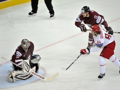 Pirmajā trešdaļā ielaižot divus vārtus 33 sekunžu laikā, 2014. gada pasaules čempionātā hokejā trešo zaudējumu piedzīvojusi Latvijas valstsvienība, kas ar 1:3 piekāpās mājinieces Baltkrievijas priekšā. Mūsējo rindās vienīgo rezultatīvo metienu izdarīja Artūrs Kulda, bet Kaspara Daugaviņa pēdējā minūtē gūtie vārti netika ieskaitīti, jo Gints Meija atradās vārtsarga laukumā.