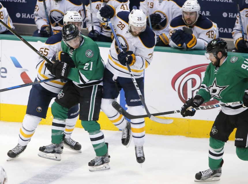 Mājiniekiem gan piederēja pārsvars spēles ziņā un daudz darba bija Bufalo vārtsargam Andešam Nilsonam. 11. spēles minūtē arī viņam nācās kapitulēt pirmo reizi, kad Patriks Šarps atklāja mājinieku rēķinu šīs nakts mačā, un pirmā trešdaļa noslēdzās ar minimālu "Sabres" vadību (2:1). Pirmās trešdaļas pēdējā minūtē Girgensons veica spēka paņēmienu pret Taileru Seginu. Brīdi vēlāk Keins saņēma noraidījumu, "Stars" centieni atlikušajās sekundēs izlīdzināt rezultātu nedeva, bet otrās trešdaļas ievadā, turpinoties vairākumam, Dalasai beidzot izdevās pārspēt Nilsonu (2:2).