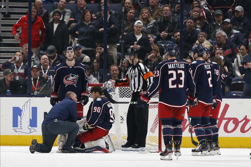 Latvijas vārtsargs Elvis Merzļikins pirmdien guva savainojumu otrajā periodā, taču Kolumbusas "Blue Jackets" komanda svinēja uzvaru pagarinājumā Nacionālās hokeja līgas (NHL) regulārā čempionāta spēlē, pārtraucot astoņu zaudējumu sēriju.