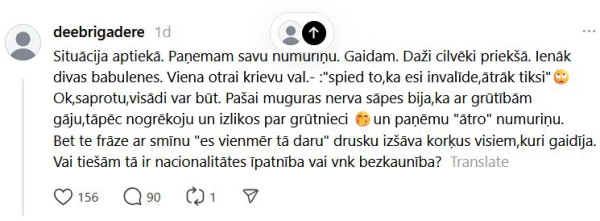 "Situācija aptiekā. Paņemam savu numuriņu. Gaidām. Daži cilvēki priekšā. Ienāk divas babulenes. Viena otrai krievu valodā: "Spied to, ka esi invalīde, ātrāk tiksi". Ok, saprotu, visādi var būt. Pašai muguras nerva sāpes bija, ka ar grūtībām gāju, tāpēc nogrēkoju un izlikos par grūtnieci un paņēmu "ātro" numuriņu. Bet te frāze ar smīnu "es vienmēr tā daru" drusku izšāva korķus visiem, kuri gaidīja. Vai tiešām tā ir nacionalitātes īpatnība vai vnk bezkaunība?" retoriski vaicā sieviete.