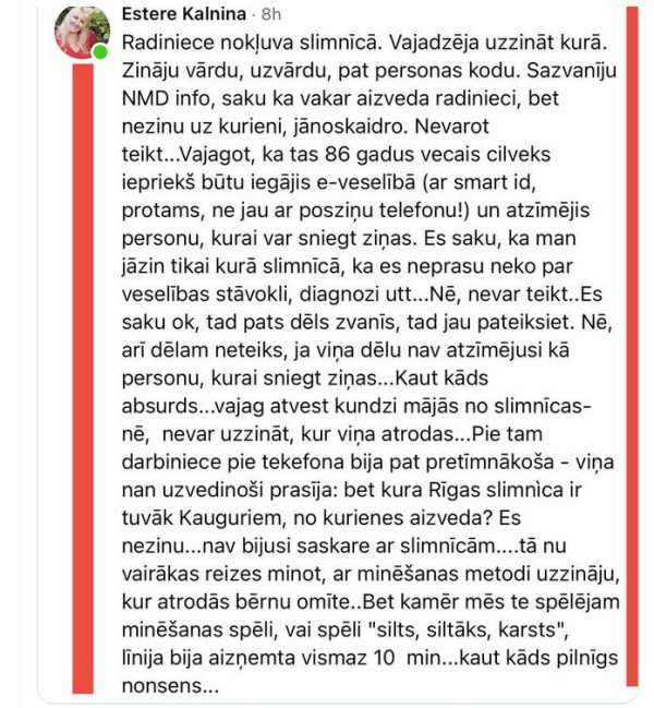 Plašu rezonansi soctīklos izpelnījies ieraksts, kas vēsta par radinieku centieniem iegūt informāciju, kurā slimnīcā atrodas viņu omīte. Ja nav ielikts vajadzīgais ķeksis e-veselībā, tad jāpaliek nezinot...