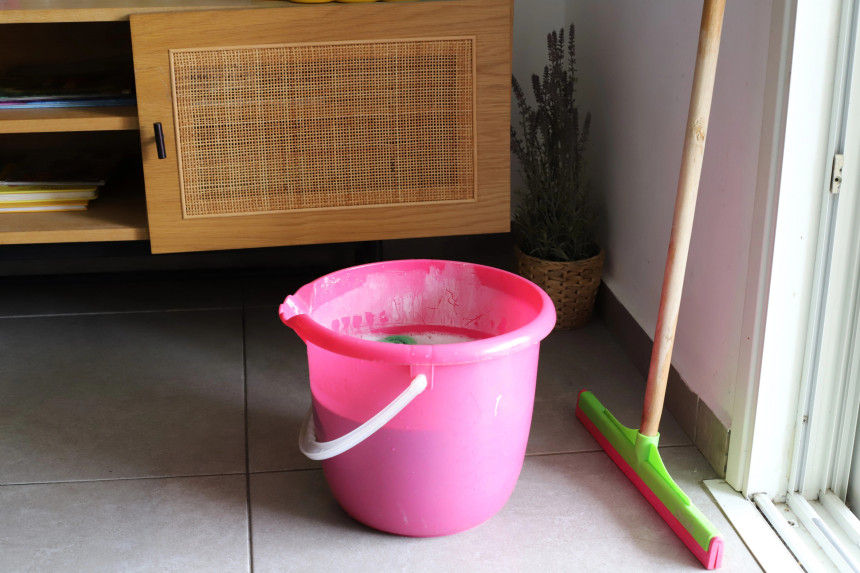 Tā kā tualetes pods nav izmantojams, ģimene nokārtojas spainī.