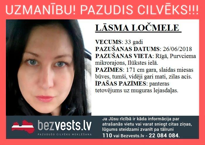 Organizācijas Bezvēsts.lv informē, ka tuvinieki joprojām meklē teju gadu pazudušo 33 gadus veco Lāsmu Ločmeli.