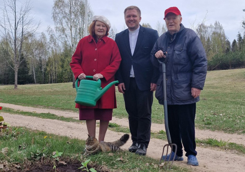 Viņa kopā ar savu vīru Imantu Freibergu un krustdēlu Mārtiņu Šteinu pagalmā stādīja saulespuķes.