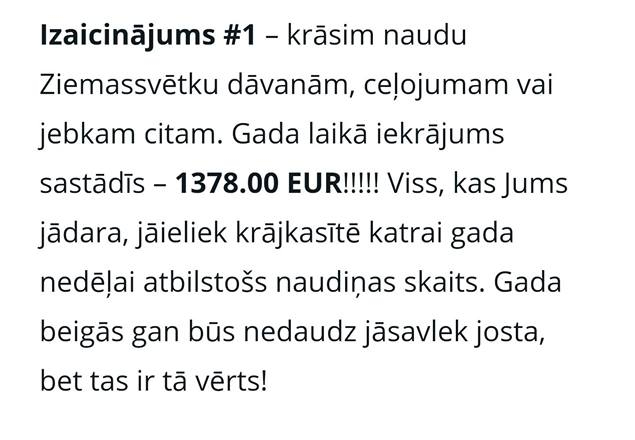 Cilvēki sociālajos tīklos pozitīvi novērtējušu kādu padomu, kā sākot ar gada pirmo nedēļu uzkrāt naudu un gada beigās saņemt precīzi 1378 eiro.