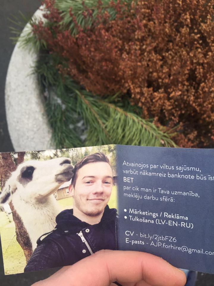 Pirmajā acu uzmetienā šķiet, ka sievietei tiešām paveicies un viņa atradusi 50 eiro banknoti, tomēr tā nav banknote, bet gan darba meklēšanas sludinājums, ko izveidojis kāds jaunietis.
