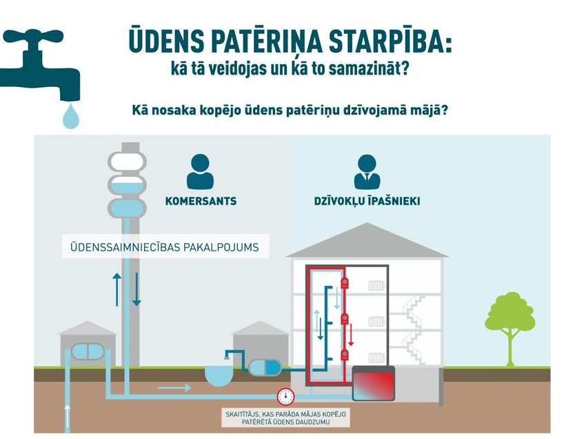 Infografikā dota informācija kā veidojas ūdens patēriņa starpība daudzdzīvokļu namos un kā to iespējams samazināt.