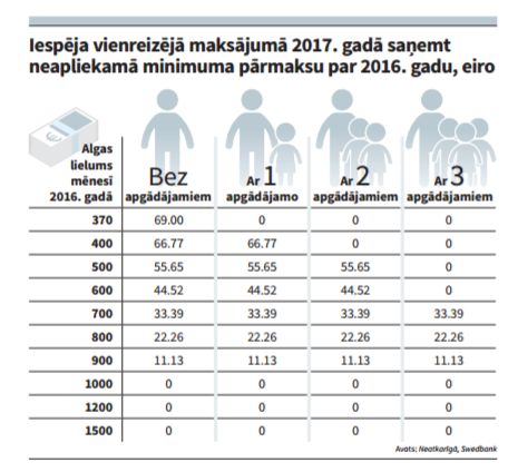 Deklarāciju skaita pieaugumu, visticamāk, ir izraisījusi iespēja, sākot ar šo gadu, atgūt pārmaksātos nodokļus saistība ar diferencēto neapliekamo minimumu. Neatkarīgā jau rakstīja, ka kopš 2016. gada neapliekamais minums tiek rēķināts atkarībā no algas lieluma - jo lielāks ir nodokļa maksātāja gada apliekamo ienākumu apmērs, jo mazāku diferencēto neapliekamo minimumu piemēro. Tiesa, piemērošana izpaudās tikai teorētiski, praktisks ieguvums būs jūtams, vien iesniedzot gada ienākumu deklarāciju. Neatkarīgās aprēķini liecina, ka strādājošais (bez apgādājamajiem), kurš pērn saņēma minimālo algu, var pretendēt uz 69 eiro lielu atmaksu, savukārt tas, kura alga uz papīra bija 800 eiro - uz 22,26 eiro atmaksu. Tajā pašā laikā iespējama situācija, ka strādājošajiem, kuru apgādībā ir viena vai vairākas personas, šāda atmaksa nepienāksies. Faktiski nelielo algu saņēmēji ar vairākiem apgādājamajiem no neapliekamā minimuma diferenciācijas vispār neko neiegūs. Tā kā šādas personas saņem atvieglojumu par apgādājamajiem, nodokļa pārmaksa neveidojas, un, lai arī teorētiski pienākas lielāks neapliekamais minimums, tam nav nekādas ietekmes uz neto ienākumiem.