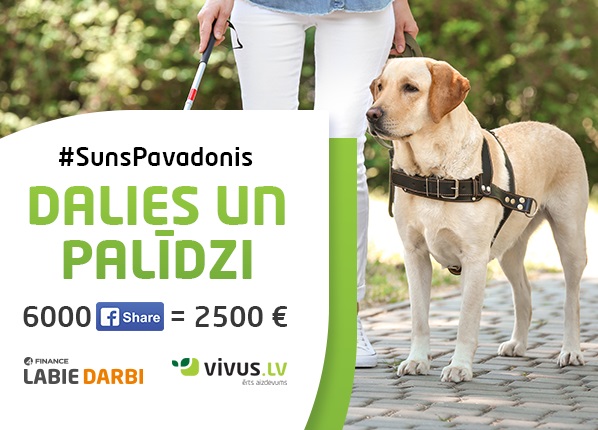 "4finance Labie darbi" un Vivus.lv jau otro gadu īsteno kampaņas, kuru mērķis ir pilnvērtīgi integrēt cilvēkus ar invaliditāti sabiedrībā. Pagājušajā gadā tika sekmīgi aizvadīta Lucavsalas pludmales labiekārtošana ar cilvēkiem ar kustību traucējumiem piemēroto inventāru - sauļošanas krēsliem, piebraucamo celiņu, šūpolēm, tualetēm un ģērbtuvēm. Šogad priekšroka tika dota neredzīgu cilvēku atbalsta projektam. "Uz suni-pavadoni gulstas milzīga atbildība par saimnieku vai cilvēku, kurš tajā brīdī atrodas blakus. Tieši tādēļ viena suņa sagatavošanai nepieciešami gandrīz divi gadi rūpīga, pacietīga un pašaizliedzīga darba un salīdzinoši lielas izmaksas, ko cilvēki ar redzes invaliditāti visbiežāk paši nevar atļauties. Šīs kampaņas ietvaros mēs aicinām sabiedrību iesaistīties, lai palīdzētu cilvēkam ar redzes traucējumiem iekļauties ikdienas dzīvē. Lai atbalstītu projektu, nepieciešams dalīties (share) ar kampaņas ierakstu, kas palīdzēs nodrošināt 1200 apmācību stundas 2500 EUR vērtībā. Cilvēkiem dalīšanās ar ierakstu nemaksās neko, bet palīdzēs padarīt kāda dzīvi vieglāku un ērtāku," uzsver 4finance Latvija izpilddirektors Gvido Endlers.