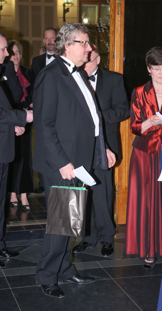 Rīgas biržā uz svinīgajām vakariņām kopā ar Zviedrijas karali un viņa kundzi ieradās aptuveni 130 lūgto viesu. Fotogrāfiem bija iespēja fiksēt tikai vakariņu sākuma daļu jeb oficiālo sasveicināšanās ceremoniju ar abiem viesiem, kā arī Valsts prezidentu Andri Bērziņu un viņa kundzi Daci Seisumu. Šīs formālās procedūras laikā sanākušos ieintriģēja operas direktors Zigmars Liepiņš, kurš pēc sasveicināšanās pasniedza karalienei Silvijai melnu dāvanu maisiņu. Jāpiebilst, ka tas pamatīgi samulsināja karalisko viešņu, taču pēc Liepiņa neliela skaidrojuma dāvanu maisiņš tika nodots karaļpāra pavadošajām personām. «Tā nebija nekāda dāvana. Es atnesu vizuālos un informatīvos materiālus par mūsu operas izrādi «Karlsons lido atkal». Mēs gribam veidot šīs izrādes viesizrādes Zviedrijā, un tā bija laba iespēja pastāstīt par šo operu,» sarunā ar »VZ« par dāvanu maisiņa saturu informēja Liepiņš.