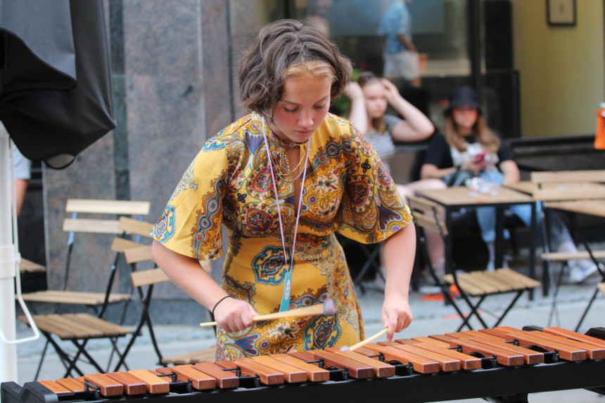 TV un radio zvaigznes Baibas Sipenieces-Gavares jaunākā meita Hermīne Sipeniece-Gavare Ielu muzikantu dienā uzstājās ar savām improvizācijām Vaļņu ielā.