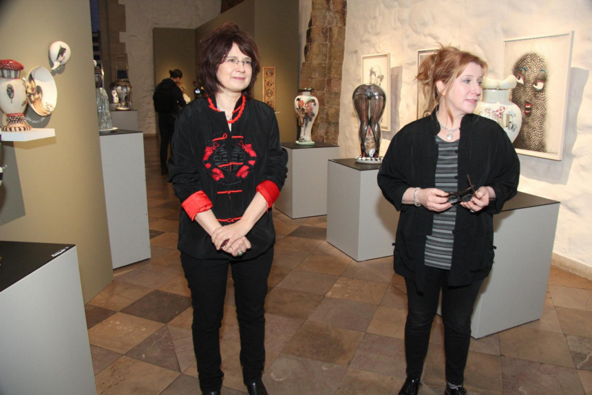 No labās - Latvijas Nacionālā mākslas muzeja direktore Māra Lāce velta izstādei atzinīgus vārdus un iepozē pie keramikas šķīvja, uz kura attēlots viņas portrets.