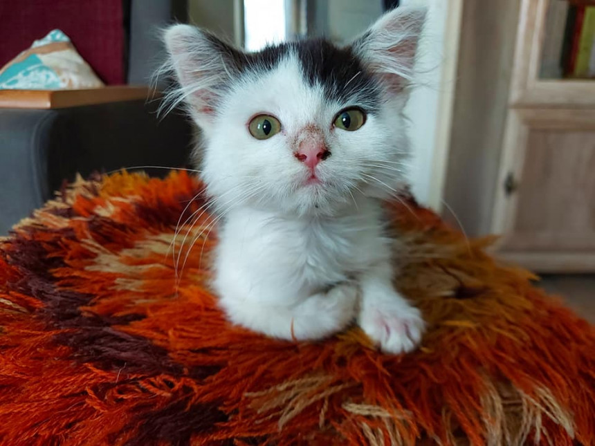 Atvedot kaķēnu mājās, bija jādomā, kā viņu izbarot, jo dzīvnieciņš bijis ārkārtīgi izbadējies. «Sākumā devām biezpienu burtiski ar tējkaroti, jo bija skaidrs - ja kaķītis pārēdīsies, viņš nomirs. Bet rija viņš tiešām nenormāli, tāpēc no virtuves nācās izvākt abu lielo dzīvnieku ēdamtraukus un arī uz galda nedrīkstēja atstāt neko ēdamu. Nu jau situācija ir uzlabojusies.»
