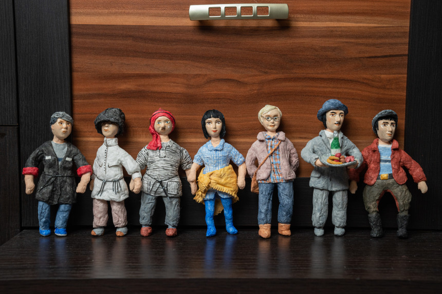 Žanna Istomina atver kārbas un rāda gan no papjēmašē darinātus dzīvniekus un klaunus, gan izšūtas eglīšu rotas... Re, acis aizķeras aiz filmas «Kaukāza gūstekne» varoņu sejām. Var pazīt! Visus! Kā dzīvi! «Jā, sejas veidoju tā, lai var pazīt! Ir, kas prasa, lai izgatavoju eglīšu mantiņas ar radinieku sejām. Skatos vaibstus, lai sanāk līdzīgi. Paradoksāli, ka ļoti daudzi vēlas, lai izgatavoju tieši filmu varoņus, ko eglītē karināt. Bija kāda sieviete, kura pasūtīja figūriņu - sevi pikantā rītatērpā... Reizēm brīnos, ko tauta grib.»